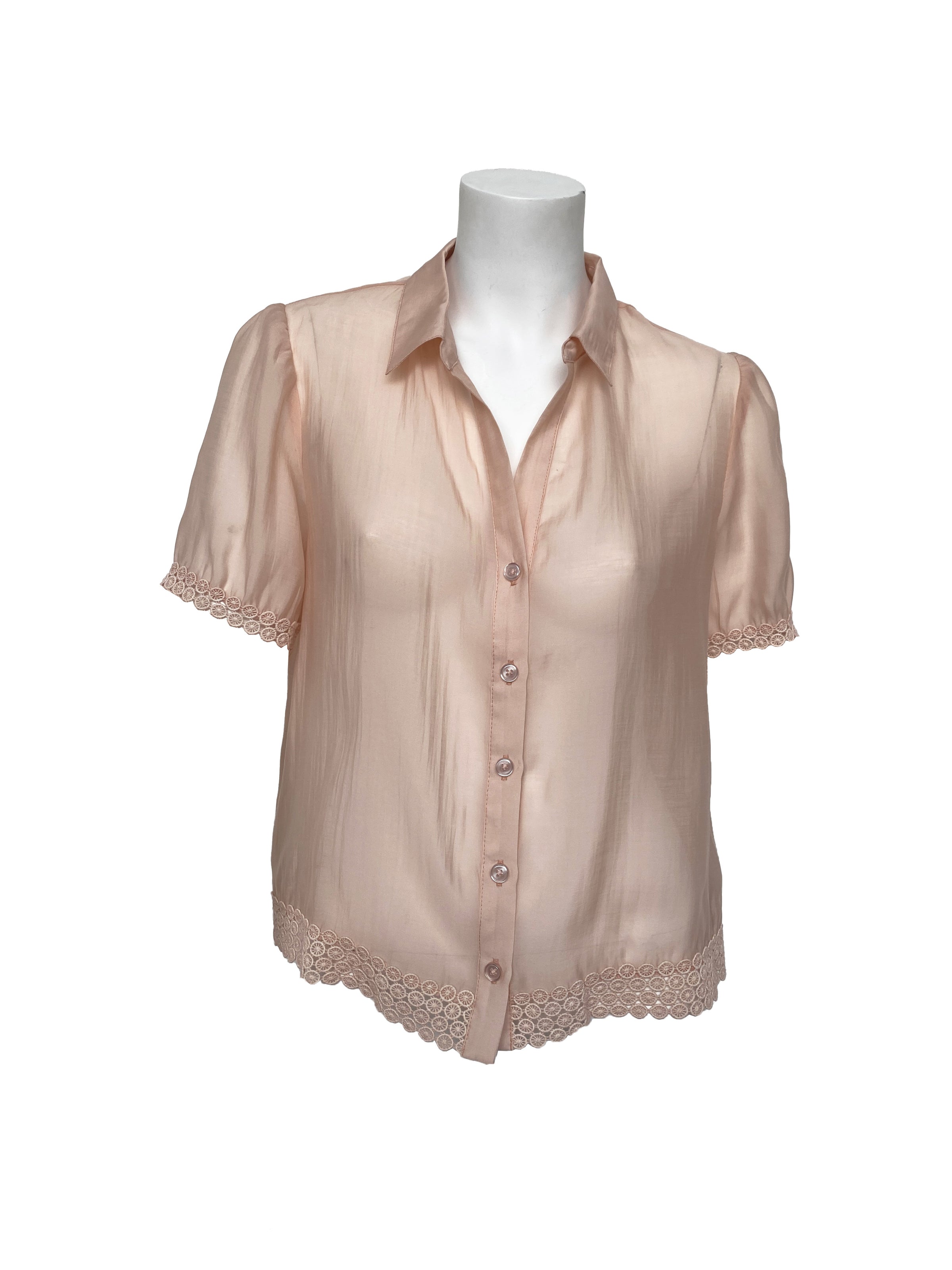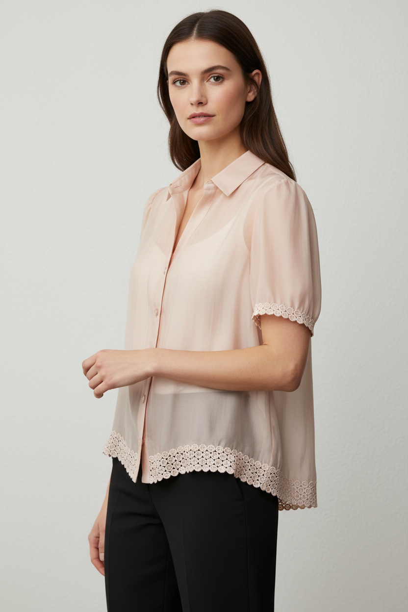 Elevate your wardrobe with this refined Point Zero sheer blouse, designed for the discerning woman who values understated elegance. The delicate fabric drapes beautifully while the intricate lace trim adds a touch of feminine sophistication. A classic collar and button-front closure create a polished silhouette perfect for layering or wearing solo. Versatile enough for the office or weekend styling, this piece embodies timeless charm with contemporary appeal. Regular fit.